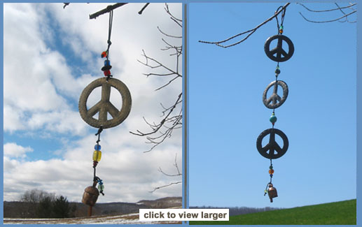 wrought iron and hang with glass beads, and feature Noah Bells for a beautiful sound. Peace signs are 4" (10 cm) diameter.