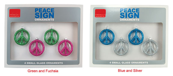 These glass and glitter peace symbol ornaments are approx. 2" / 5.08 cm in diameter.