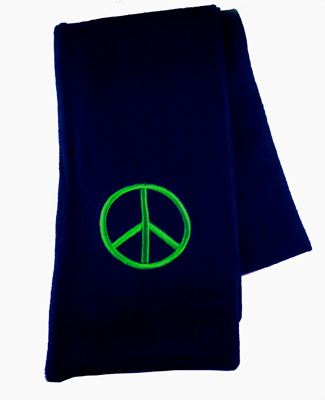 This navy peace scarf features a metallic lime